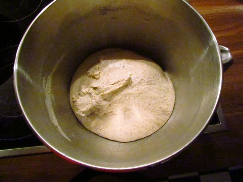 Väg upp ingredienserna i en bunke och arbeta degen i degblandare tills degen blivit kompakt. I boken står det faktiskt att man ska hälla upp mjölet på bakbordet och göra en urgröpning i den och sätta saltet, vattnet och surdegen dit och därmed börja sakta blanda in det med mjölet. Jag lovar att jag ska testa detta någon gång, men nu blev det inte av.