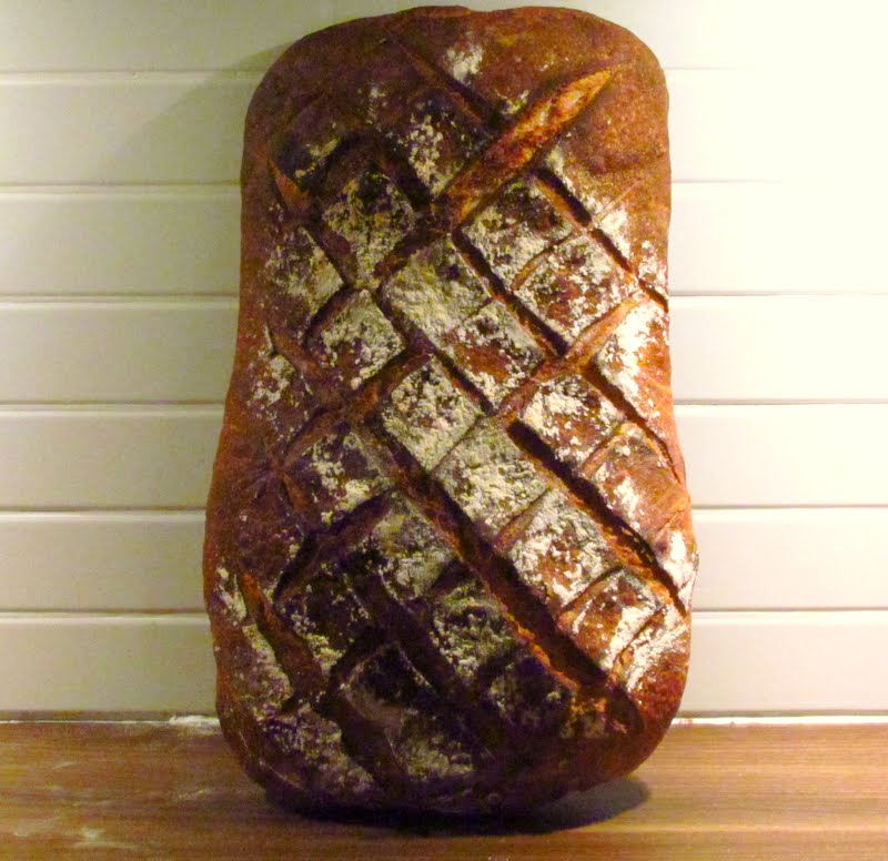 Sätt ugnen på 260 grader. Lyft brödet försiktigt ut ur lådan och på en plåt eller brödspade. Mjöla på brödet och snitta brödet därefter. Jag var lite stolt över min snittning, TROTS att den nog inte är jätte fin. Men lite såg man något, plus att brödet ju hade kracklerat ganska fint. Ställ brödet i ugnen och släng in någon dl kokhett vatten för att bilda ånga. Sänk värmen till 240 grader. Grädda brödet i 50 minuter. Ta ut brödet och låt det svalna i minst 45 minuter. Det här poängterade Sebastien i boken; dvs att låt bröden svalna. Men det är så svårt ibland...