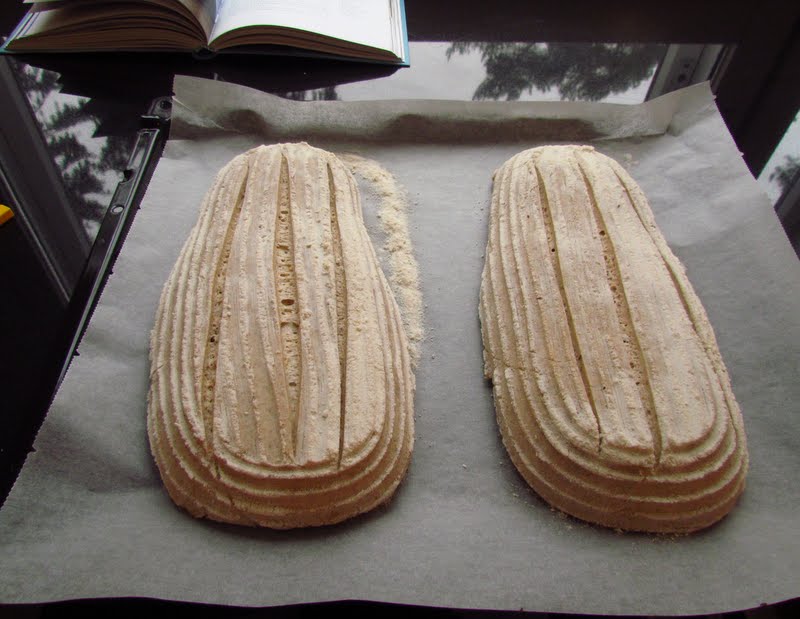 Jag lät bröden jäsa på bakbordet, men detta var inte en bra idé. Detta för att när jag flyttade över bröden till plåten så sjönk de ihop lite (eller mycket). Sätt ugnen på 270 grader i god tid och ställ en ugnsplåt på understa hyllan. När bröden jäst färdigt, ställ in dem i ugnen och kasta in en liten kopp vatten på plåten underst i ugnen för att få ånga i ugnen. Stäng ugnsluckan snabbt när du kastat in vattnet. Sänk ugnstemperaturen till 200 grader efter 15 minuter. Låt bröden ännu stå i ugnen i 30-35 minuter tills brödens innertemperatur uppnår 98-99 grader. Det lönar sig att vara noga med temperaturen och kanske göra ett extratest när du tagit ut bröden - testet går ut på att vända brödet upp och ner och knacka på bottnet. Bottnet skall vara hårt (eller hårdare) och brödet ska låta ihåligt.