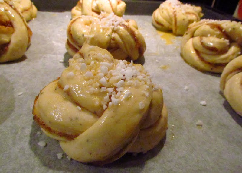 Blanda jästen i rumsvarm mjölk och tillsätt dit saltet, sockret, kardemumman och äggen. Blanda med  ungefär hälften av mjölet och det smälta smöret. Sätt med mera av mjölet och knåda degen elastisk. Låt vila i rumstemperatur i någon timme. Det är bäst att börja baka innan degen börjar jäsa jätte mycket.