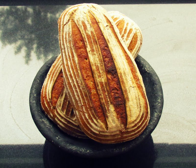 Jag blev helt eld och lågor av att brödet fick så fin färg. Jag har varit lite orolig och förundrat mig över färgen på mina bröd, vissa av dem har tenderat att vilja bli lite gråa och det är ju inte jätte aptitligt. Jag tror att jag kanske kommit på orsaken till den gråa färgen. Om jag har fel och DU vet orsaken så snälla berätta åt mig. Nåja, men jag tror att en del av orsaken är att det i vissa recept står att man värmer ugnen till t.ex. 250 grader, ställer in brödet, sprutar in vatten så det bildas ånga och sänker värmen efter en stund eller alternativt direkt. Nå här tror jag att ett fel ligger, det här brödet gräddades i 250 grader i hela 50 minuter och dessutom återgick jag till att ställa en plåt nederst i ugnen och kastade in någon deciliter vatten när jag ställde in bröden. Då bildas ordentligt med ånga. Jag har använt mig av en blomspruta en tid tillbaka och tror att vattenmängden som då kommer i ugnen och bildar ångan helt enkelt är för lite och vattnet avdunstar helt. Måste fara på jakt efter en effektivare spruta, för att när man använder baksten kan man nog inte kasta in en deciliter vatten på brödet. Nå, på något sätt ska detta lösas. Men hurra åter för brödets färg! Och gott var det också.