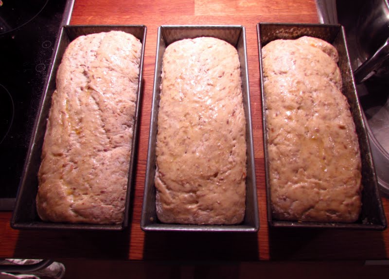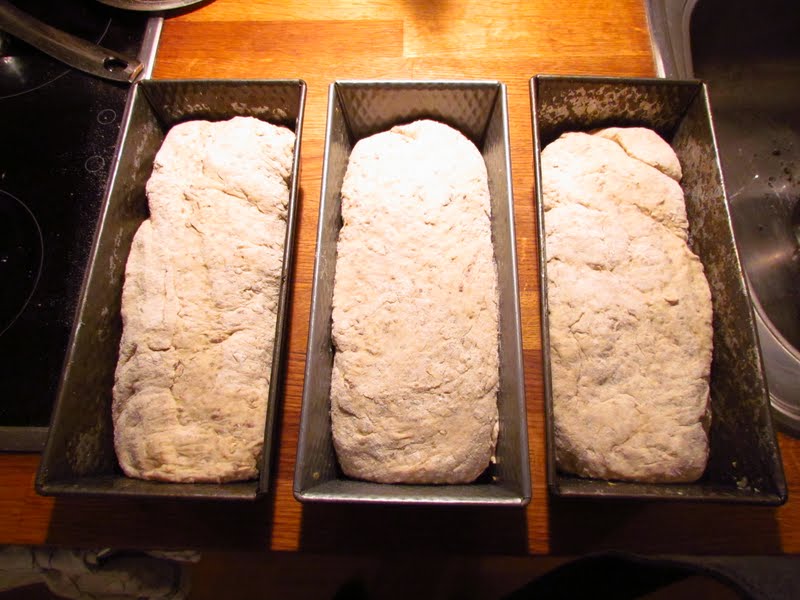 Låt degen vila i bunken i ca 30 minuter. Lyft den sedan på bakbordet och forma till tre avlånga limpor som du sätter i brödformarna och trycker ut degen ordentligt i formarna. Låt jäsa i formarna i rumstemperatur i 35-45 minuter.