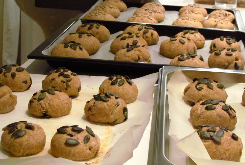 Pensla bröden med smält smör innan du gräddar dem. Sätt ugnen på 250 grader. Sätt in bröden i ugnen och sänk temperaturen direkt till 200 grader. Spruta in vatten med en blomspruta underst i ugnen. Lufta ugnen efter 10 minuter. Grädda bröden i ca 35 minuter, kolla att bröden innertemperatur är 98 grader. Ta bröden ut formarna och sätt dem tillbaka in i ugnen uta formarna i ca 6 minuter. Detta gör ytan ljuvligt knaprig och god.