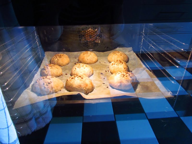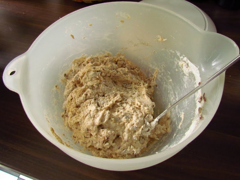 Det var första gången jag testade på denna "rutsnittning" och det blev så fint tycker jag. Två av rutorna fick lite onödigt mycket färg på sig, men i sin helhet blev det fint. Om du tittade på videon där Sebastien bakar så såg ju snittningen av brödet superlätt ut och det kanske är det när man blivit mera tränad. Det kräver framförallt säkerhet och självförtroende - men också att degen är bra och kniven glider genom degen. Det här ska jag öva på mer... Det är roligt när man lyckas.När degen känns kompakt, låt den vila i bunken eller på bakbordet i 1 timme. När timmen gått ska degen knådas ordentligt. Om du fortsätter med degblandare knåda degen då på lägsta hastigheten i 10 minuter.