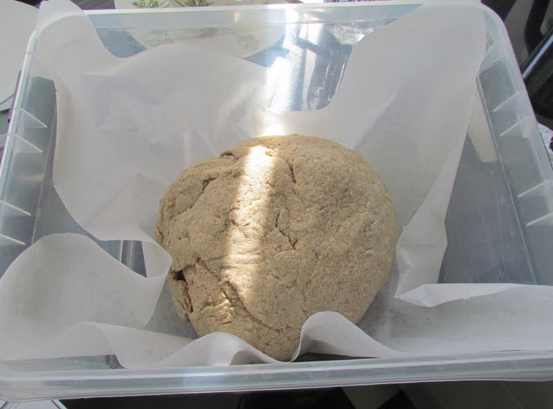 Rör ut jästen i vattnet och tillsätt därmed resten av ingredienserna. Degen behöver inte knådas utan bara blandas ordentligt. Låt vila i ca 45 minuter. Jag satte min bunke in i en plastpåse för att degen inte skulle torka.