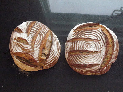 Ta upp degen på ett mjölat bakbord och dela den i två-tre bitar. Forma bröden till bröd, dvs runddriv dem så att ytan blir spänstig och skarven täcks in under bottnet. Lägg bröden med skarven uppåt i mjölade brödkorgar. Låt bröden jäsa 1-1,5 timmer. Mina bröd jäste faktiskt övernatten i kylskåpet och gräddades på morgonen. Ugnen ska vara på 275 grader när du ska grädda dem. Om du tänker gräfdda bröden på plåtar, ställ en plåt nederst i ugnen. Ställ bröden på plåtar med bakplåtspapper eller på en sten i ugnen och spruta in vatten eller kasta lite vatten på plåten underst. När du ställt in bröden sänk temperaturen till 250 grader. Efter 20 minuter kan du sänka graderna ytterligare till 200 grader. Mina bröd började få ganska bra med färg så jag ställde ett bakplåtspapper på dem de sista 15 minuterna. Bröden ska totalt gräddas 30-35 minuter eller tills innertemperaturen uppnått 98 grader.