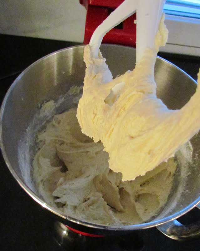 Tillsätt äggen en i tagen under sakta omrörning, blanda bakpulvret och vaniljsockret med vetemjölet och häll det försiktigt i bunken. Blanda om. Tillsätt mjölken.