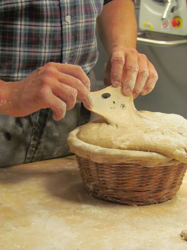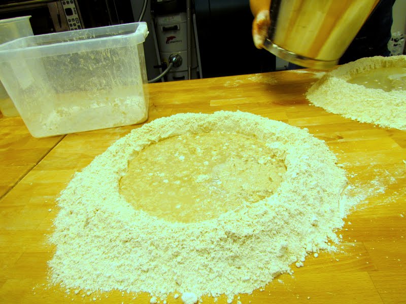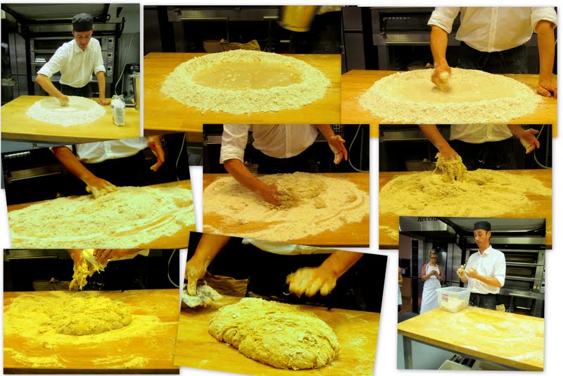 Först lagade Sebastien en deg och vi följde på vad han gjorde. Han gjorde alltså degen för hand genom att laga en krater av mjölet, hälla med saltet på bordet, därmed vattnet och surdegen. Sedan börjar man blanda in mjölet i vattnet och surdegen genom att tunna försiktigt lager för lager mjölväggen. Det här tog inte länge, kanske högst ett par minuter för Sebastien att ha sin deg färdig och sätta den i plastlådan och vila.